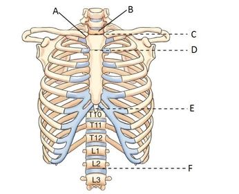 | A. sternoclavicular joint B. T1 C. jugular notch (T2-3) D. sternal angle (T4-5) E. xiphoid tip (T9-10) F. inferior costal margin (L2-3) | |