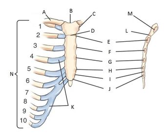| A. clavicle B. jugular notch C. facet for 1st costocartilage D. sternal angle E. 2nd F. 3rd G. 4th H. 5th I. 6th J. 7th K. costal cartilage L. sternal angle M. facet for 1st costocartilage N. ribs | |