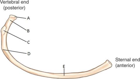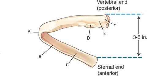 | A. angle B. costal groove C. body D. articular facet - tubercle E. neck F. head | |