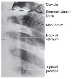 | A. sternal extremity of clavicle B. sternoclavicular joints C. manubrium D. body E. xiphoid tip | |
