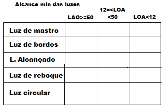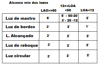 | Luzes de uma embarcação: nome-cor-angulação | masthead light - branca continua - 225 sidelights - verde/encarnada - 112,5 Sternligths - branca continua - 135 Towinglights - amarela continua - 360 flashing light - 120 lampejos/seg |