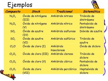 | Nomenclatura de anhídridos (Stock) | la nomenclatura de stock consiste en escribir la palabra "óxido" + elemento no metálico y a continuación el número de valencia del elemento no metálico en números romanos y entre paréntesis. Ejemplos: CO2: óxido de carbono (IV) Br2O3: óxido de bromo (III) |
