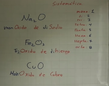 | Nomenclatura de los óxidos (Sistemática) | La nomenclatura sistematica toma en cuenta el número de moleculas de cada elemento. Se nombra: Prefijo + "OXIDO DE" + prefijo + nombre del elemento. El prefijo depende del número de moleculas que tenga el elemento: 1 - mono 2 - di 3 - tri 4 - tetra 5 - penta 6 - sexta 7 - hecta 8 - octa 9 - nona 10 - deca Ejm: N2O3 = Trioxido de dinitrogeno S2O4 = Tetraoxido de diazufre Li2O = Oxido de dilitio Se2O4 = Tetraoxido de diselenio Al2O3 = Trioxido de dialuminio |