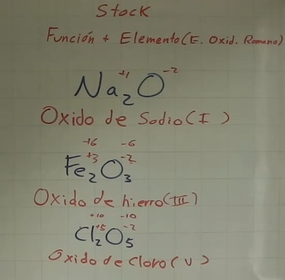 | Nomenclatura de óxidos (Stock) | La nomenclatura stock toma en cuenta los estados de oxidación de los elementos sin contar el oxigeno. Se nombra: "OXIDO DE" + nombre del elemento + (estado de oxidación del elemento) |