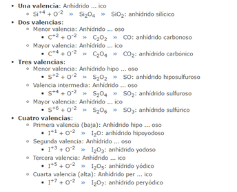 | Nomenclatura de anhídridos (Tradicional) | Nomenclatura tradicional: la nomenclatura tradicional de los anhídridos se realiza nombrando la palabra anhídrido seguido del elemento no metálico. Para ello se debe de tener en cuenta la valencia del elemento no metálico siguiendo los siguientes criterios: |