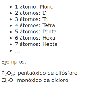 | Nomenclatura de anhídridos (Sistemática) | a nomenclatura sistemática consiste en la utilización de un prefijo que depende del número de átomos de cada elemento seguido de la expresión "óxido" + el elemento no metálico precedido de la valencia del elemento no metálico. Los prefijos utilizados dependiendo del número de átomos en esta nomenclatura son: |
