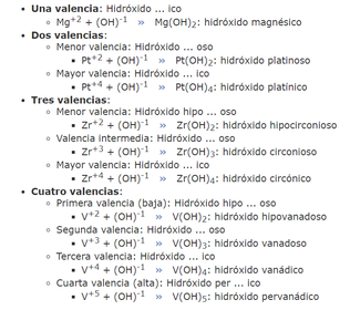 | Nomenclatura de hidróxidos (Stock) | en la nomenclatura de stock comienza con la palabra hidróxido seguido del elemento metálico con la valencia del mismo en números romanos entre paréntesis. Ejemplos: HgOH: hidróxido de mercurio (I) Sn(OH)2: hidróxido de estaño (II) |