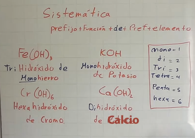 | Nomenclatura de hidróxidos (Sistemática) | En la nomenclatura sistemática se anteponen los prefijos numéricos a la palabra hidróxido. Ejemplos: Be(OH)2: dihidróxido de berilio Sn(OH)4: tetrahidróxido de estaño Fe(OH)3: trihidróxido de hierro |