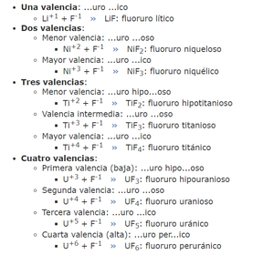 | Nomenclatura de Sales (Tradicional) | La nomenclatura tradicional de las sales neutras se realiza nombrando el elemento no metálico terminado en uro seguido del elemento metálico. Para ello se debe de tener en cuenta la valencia del elemento metálico siguiendo los siguientes criterios: |