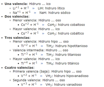 | Nomenclatura de Hidruros (Tradicional) | la nomenclatura tradicional de los hidruros metálicos se nombra con la palabra hidruro seguido del elemento metálico teniendo en cuenta la valencia del elemento metálico: |