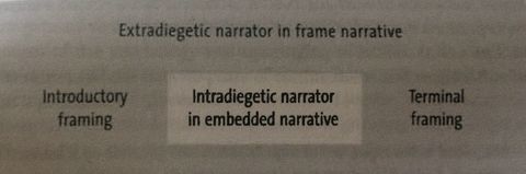 | story - within a story? | In a story - within-a-story, an embedded narrative (Binnenerzählung) within a frame narrrative (Rahmenerzählung), the intradiegetic narrator tells his/her embedded story from within the primary or frame narrative, which is told by the extradiegetic narrator. Embedded narratives mostly take an introductory but rarely a terminal framing, and often both. |