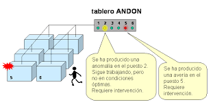 | Andon (行灯) | Es el término japonés que significa "ayuda". Es un tablero de luces o señales luminosas que indican las condiciones de trabajo de un área entera de producción, el color indica el tipo de problema o la condición de trabajo. |