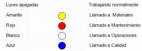 | Los Sistemas Andon Multicolor | Indican al supervisor del área el lugar y el tipo de anomalía, pero como esta señalado con colores específicos para los departamentos de apoyo como mantención, calidad, suministros permite que ellos se enteren inmediatamente del problema. |