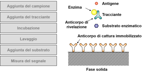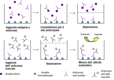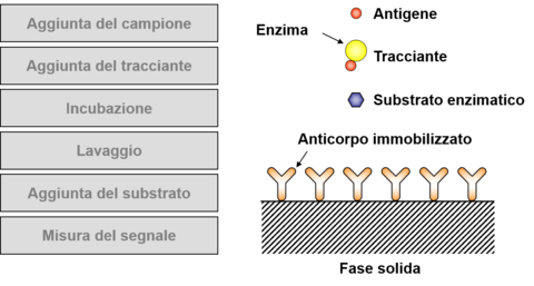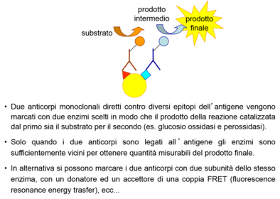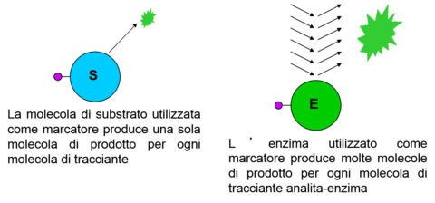 | Why is it more advantagous to use an enzyme as a marker? | L’attività catalitica dell’enzima permette di amplificare il segnale analitico (un solo enzima genera moltissime molecole di prodotto). Il limite di rivelazione del metodo è quindi significativamente inferiore rispetto ai metodi basati sull’uso di substrati enzimatici o molecole fluorescenti o chemiluminescenti come marcatori. |