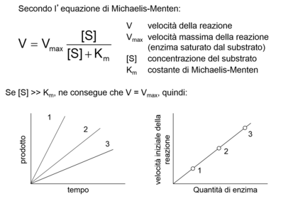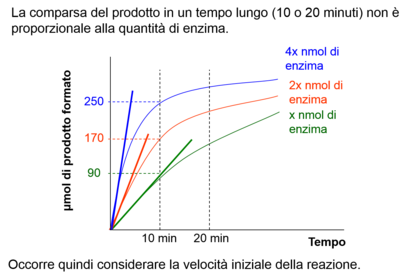 | Why are the enzymes added in excess of substrate? | Si può scegliere di misurare la velocità di scomparsa del substrato o quella di comparsa del prodotto. Il secondo metodo è preferibile poiché la misura è più accurata (ad es. da 0 a 1% per la comparsa del prodotto, da 100% a 99% per la scomparsa del substrato), soprattutto considerando che occorre lavorare in condizioni di eccesso di substrato. + for quicker reaction |