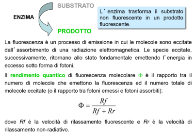 | What is the concept of fluorescence | L’enzima trasforma il substrato non fluorescente in un prodotto fluorescente La fluorescenza è un processo di emissione in cui le molecole sono eccitate dall’assorbimento di una radiazione elettromagnetica. Le specie eccitate, successivamente, ritornano allo stato fondamentale emettendo l’energia in eccesso sotto forma di fotoni. |