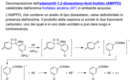 | What does AMPPD stand for? and whcih enzyme catalyses the decomposition? | AdaMantil-1,2-diossietano-fenil-fosfato enzyme: fosfatasi alcalina (AP) |