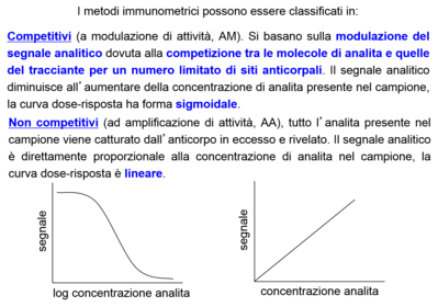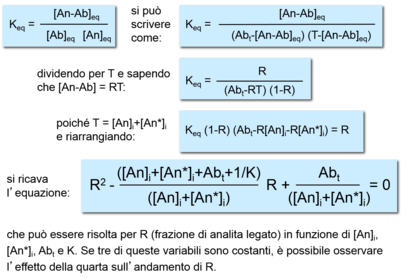 | What does R stands for as a parameter to obtain a better graph for competitive methods? | Si indica con: Abt = concentrazione totale di anticorpo = [Ab]eq + [An-Ab]eq T = concentrazione totale di analita = [An]eq + [An-Ab]eq ovvero = [An]i + [An*]i (dove An è l’analita nel campione e An* è l’analita marcato) R = [An-Ab]eq/T, cioè frazione di analita legato. Questa è la variabile che viene di solito determinata nei metodi immunometrici |