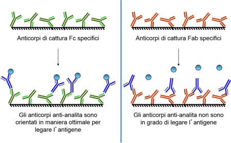 | How is an antibody obtained? | Un anticorpo specifico per l’analita si ottiene immunizzando un animale da laboratorio con l’analita stesso. L’analita è in grado di stimolare una risposta immunitaria, quindi la produzione di anticorpi solo se ha una massa relativamente elevata (PM > 1000 Da). In questo caso viene chiamato antigene e funziona da immunogeno. La regione di antigene che si trova in contatto diretto con l’anticorpo è detta epitopo o determinante antigenico. Gli animali più utilizzati sono coniglio e capra per anticorpi policlonali, topo per anticorpi monoclonali |