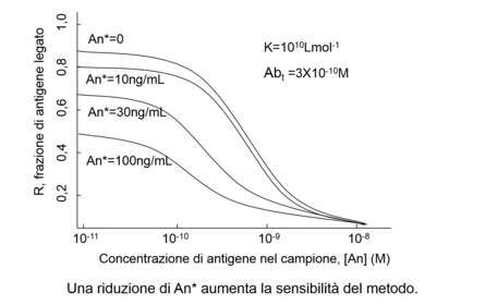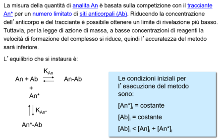 | How can we reduce the detection limit? | - Aumentare la costante di affinità dell’anticorpo (l’antigene viene catturato più efficacemente dell’anticorpo) - Migliorare la rivelabilità assoluta del tracciante (in questo caso il limite di rivelazione dipende direttamente da essa) ottimizzando le condizioni di rivelazione, utilizzando principi di rivelazione maggiormente sensibili o sistemi di rivelazione amplificati. |