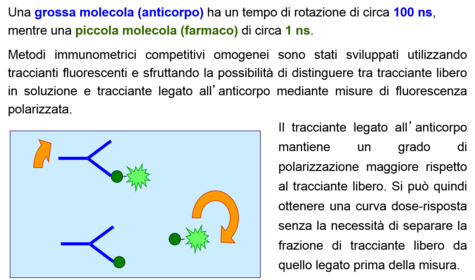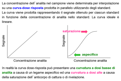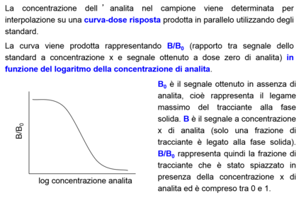 | What properties must the tracciante have in order to be good? | Il tracciante deve essere una molecola caratterizzata da un elevato rapporto segnale/massa. Questo permette di ottenere un segnale altamente rivelabile anche in presenza di piccole quantità di tracciante, quindi di fare avvenire la competizione in presenza di poche molecole, abbassando il limite di rivelazione del metodo. |