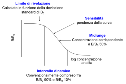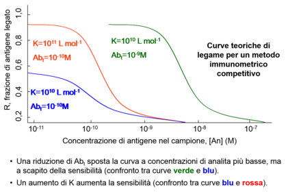 | Describe the following graph: | Una riduzione di Abt sposta la curva a concentrazioni di analita più basse, ma a scapito della sensibilità (confronto tra curve verde e blu). Un aumento di K aumenta la sensibilità (confronto tra curve blu e rossa). |
