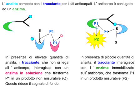 | Why is it possible to use an enzyme as a marker? | E’ lecito chiedersi se un piccolo aptene (0,3-1 kDa) chimicamente legato ad un enzima (40-100 kDa), non sia impedito nel legame all’anticorpo a causa di un forte ingombro sterico. Tuttavia, visto che l’anticorpo è stato prodotto utilizzando come immunogeno l’aptene coniugato con una proteina carrier (60-100 kDa), è molto probabile che gli anticorpi riescano a legare l’aptene anche nella molecola di tracciante. La sintesi dell’immunogeno viene eseguita in modo da ottenere un elevato rapporto di coniugazione aptene/proteina e quindi esporre numerose molecole di aptene sulla superficie dell’immunogeno; la sintesi del tracciante enzimatico viene condotta in modo da ottenere un basso rapporto di coniugazione aptene/proteina e quindi un elevato rapporto segnale/massa, che produce un limite di rivelazione del metodo più basso. |