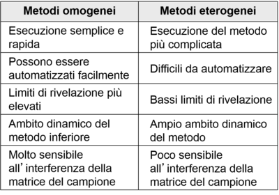| What's the difference between heterogeneous and homogeneous? | Eterogenei (su fase solida) Il metodo di rivelazione non permette di distinguere tra tracciante legato all’anticorpo e tracciante libero. Questi metodi necessitano di una separazione della frazione libera da quella legata prima della misura, quindi prevedono l’immobilizzazione di un componente (antigene o anticorpo) su una fase solida; in alternativa si può procedere mediante precipitazione del complesso antigene-anticorpo utilizzando glicole polietilenico o un secondo anticorpo in eccesso. Omogenei. Il legame del tracciante all’anticorpo ne modula (aumenta o riduce) l’attività. Questi metodi non necessitano della separazione della frazione libera da quella legata e quindi sono eseguiti in fase liquida. |