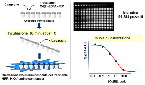 | Explain the method for analysis of Cadmium (II) in water | * competitive method with monoclonal antibodies A. pre-analytic phase: 1) dilution of the sample with water 1/10 - 1/100 v/v with buffer 2) add an excess of EDTA |