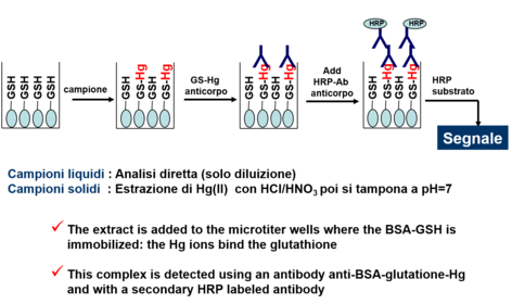 | How can you produce antibodies for the identification of metal ions? | Me + EDTA: Si produce un anticorpo contro un chelato dello ione metallico, legato ad una proteina: per esempio Me-EDTA-BSA L’anticorpo non riconosce il metallo ma l’intero complesso Me-EDTA Me +GSH; Si produce un anticorpo contro un complesso Me-Proteina o Me-Molecola organica: Glutatione (GSH): i suoi gruppi tiolici liberi legano fortemente il Hg(II). L’anticorpo riconosce il complesso Me-GSH |