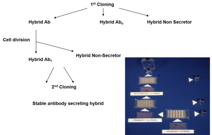 | How do we clone cells for obtaining a single antibody? | le cellule dei pozzetti positivi vengono diluite diverse volte con terreno di coltura, fino ad ottenere una singola cellula in ogni pozzetto di una piastra per coltura cellulare. Da quella cellula si origina poi una linea cellulare di cellule geneticamente identiche. Si testano nuovamente le linee cellulari, per identificare quelle positive. |
