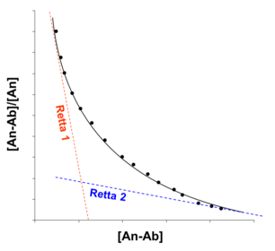 | What do the two lines (1&2) say about the antibody? | eterogeneità (differenza tra le due Keq); --> de twee rico's specificità (gli anticorpi con Keq vicina alla Keq minima sono quelli con minore specificità e si possono cercare strategie per minimizzare il loro effetto). |