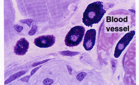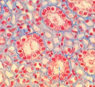 | what are the red fibers? blue dots? | Collagen - type 1 blue elongate nuclei are fibroblasts/fibrocysts |