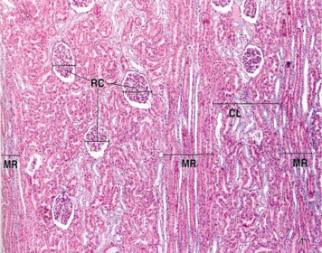 | What type of tissue surrounds the glomerulus of the kidney? What about away from it? | (spaghetti and meat balls) Simple squamous epithelium simple cuboidal epithelium |