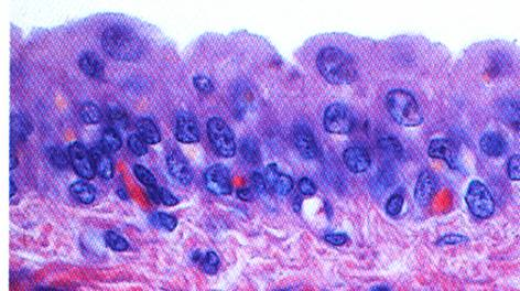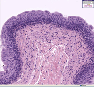 | Describe this type of epi | Transitional epithelium Dome shaped cells on top layer, some can be binucleated |