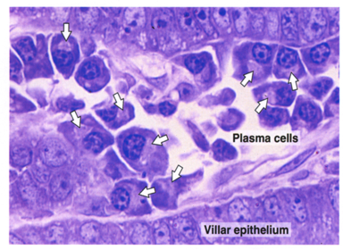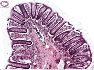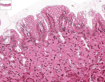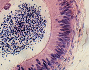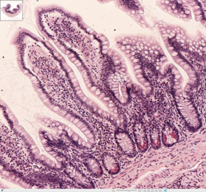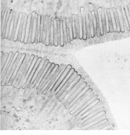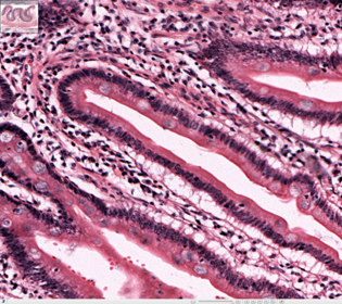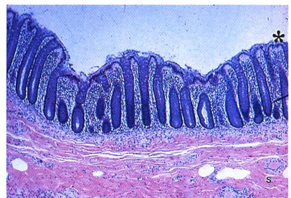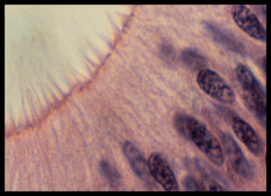 | what type of epi? and what is the cell specialization between them? | Simple columnar epi, with terminal bars between the columnar cells |