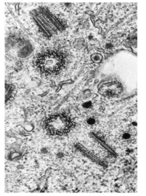 | What are the round, hollow structures? | Centrioles, the base of cilia, arranged in 9 triplets of microtubules |