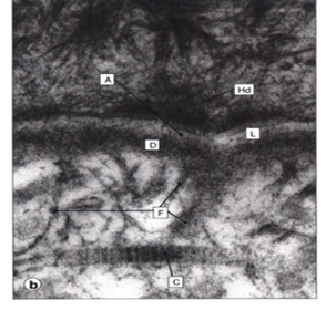 | Describe the fuzzy dark stuff on each cell | Desmosomes (Macula adherens) |