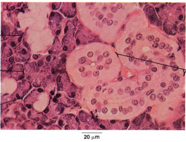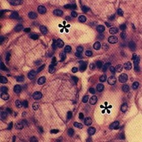 | what type of duct is shown by the "*"? | intercalated duct, look at the simple cuboidal epi |