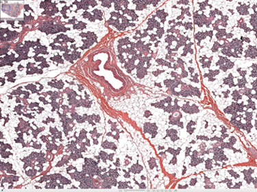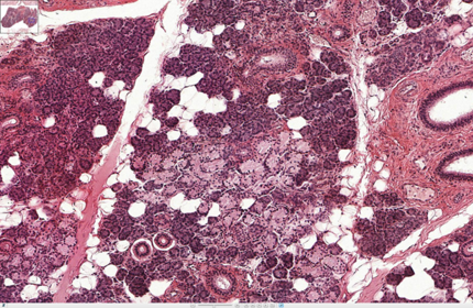 | how can you tell this is the parotid gland? | it only does serous secretion and you can see fat |