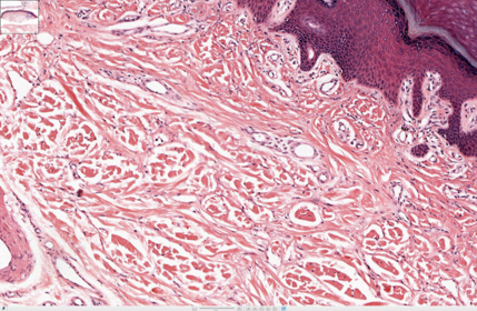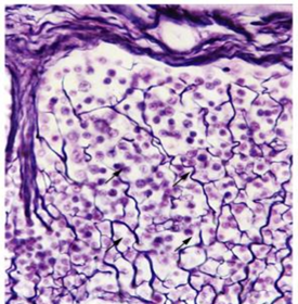 | What types of collagen can be seen here? | Darker area: BL, type 4 lighter, anchoring: reticular, type 7 |