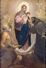 | Ludovico Carracci, Madonna dei Bargellini, 1587, o/c, 9 x 6, Pinacoteca Nazionale, Bologna, (Originally in Church of Monache Convertite) * Patron: Bargellini family * Not yet baroque, this is counter reformation * Very clear iconography * Saint Francis of Assisi (brown) * Saint Dominic of Bologna (black with white collar) * Mary wears a red undergarment * Lapis lazuli colors her blue robe (along with azurite * Blue is because she’s queen of heaven (sky) and intercessor (sea) * Mary Magdalene represents repentance (bottom right) * Mrs Bargellini is in the bottom left * Usually Madonna is in the middle, so this is asymmetric, like Titian | |