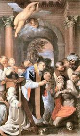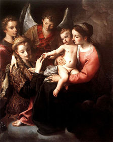 | Annibale Carracci, Mystic Marriage of Saint Catherine, 1586, o/c, 63 x 46, Capodimonte, Naples, Originally for Farnese Family in Parma * Farnese patronized the Carracci * Constantine had 4 co-emperors -Maxenias was one * He liked Catherine of Alexandria and wanted her, she was celibate, she married Jesus symbolically, Maxeniaes had her torn apart on spiked wheels, but she was saved by heaven, then beheaded and died anyway * The painting is derived diagonally between poor and fancy people * This one is a private commission and devotion | |