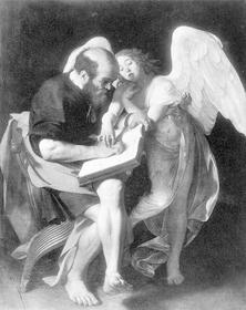 | Caravaggio, Inspiration of St Matthew, 1602-03, o.c, 9’8” x 6’5”, Contarelli Chapel, San Luigi dei Francesi, Rome Angel inspring Matthew to write the gospel, telling him what to write | |