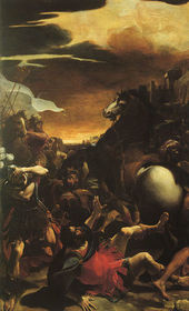 | Ludovico Carracci, Conversion of St Paul, 1587-89, 110” x 67”, Bologna, Pinacoteca Nazionale * Caravaggio is simplifying the scenes, making them less busy * Carracci’s is way busier * Paul's chains are in Rome * The Church of St Peters is over Peter’s grave * All insitu, never moved | |