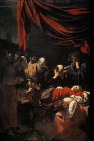 | Caravaggio, Death of the Virgin, 1601-02, o/c 12’ x 8’, Louvre, Paris. Originally for Santa Maria della Scala, Rome. * The Carmelites at this church were discout, not wearing shoes * Mary’s dying in the picture, it was rejected because she looks dead * He went and observed the dead body of a prostitute pulled out of a river * Vincenzo Giustiniani bought it in the end | |