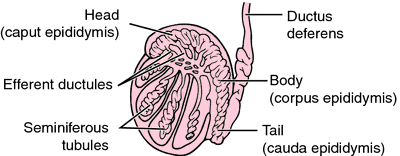 | Epididymis: | a highly convoluted duct behind the testis, along which sperm passes to the vas deferens. |