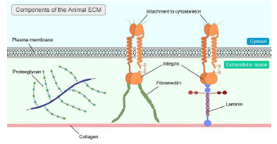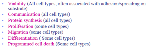| Cell surface interactions | proteins + receptors ligand-receptor (integrin) binding: adhesion, contraction , motility, secretion, proliferation |