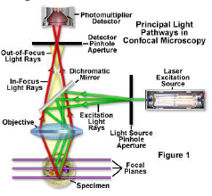 | Confocal fluorescence microscopy | improves optical resolution and contrast using point illumination and spatial pinhole enables reconstruction of 3D structures from obtained images |