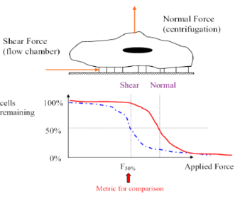 | Centrifugation Assay (Normal Force) | 1. cell seeded 24 well plate, w surface coating, specified time 2. plate inverted in centrifuge MEASURES: cells attached vs. applied Force |